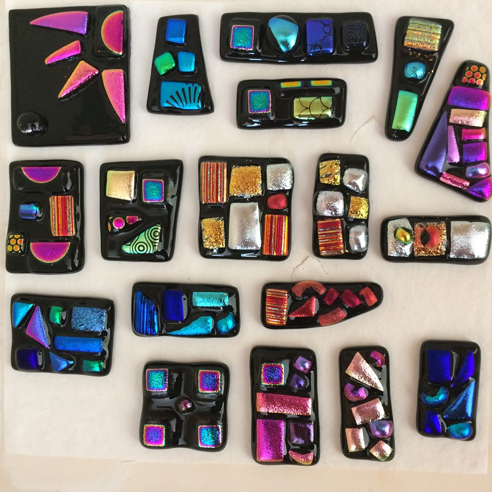 My workshops offer flexibility in cost and timescale to make unique pendants and/or brooches. I provide pre-cut shapes of glass and you have a fun and relaxing time picking through the trays of coloured glass pieces to choose your unique combination of colour and design. The dichroic glass used has metal layers on the surface that provide beautiful colours, often displaying more than one colour in a single piece.